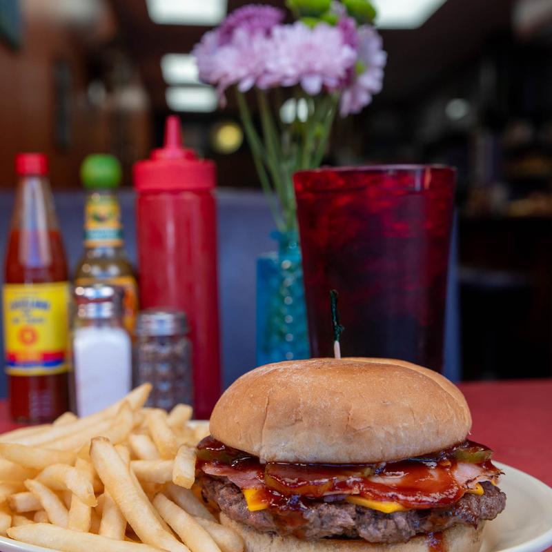 Beef burger with Swiss cheese, green chiles, tomato, and onions. Served with chips • Add Fries +$2.75