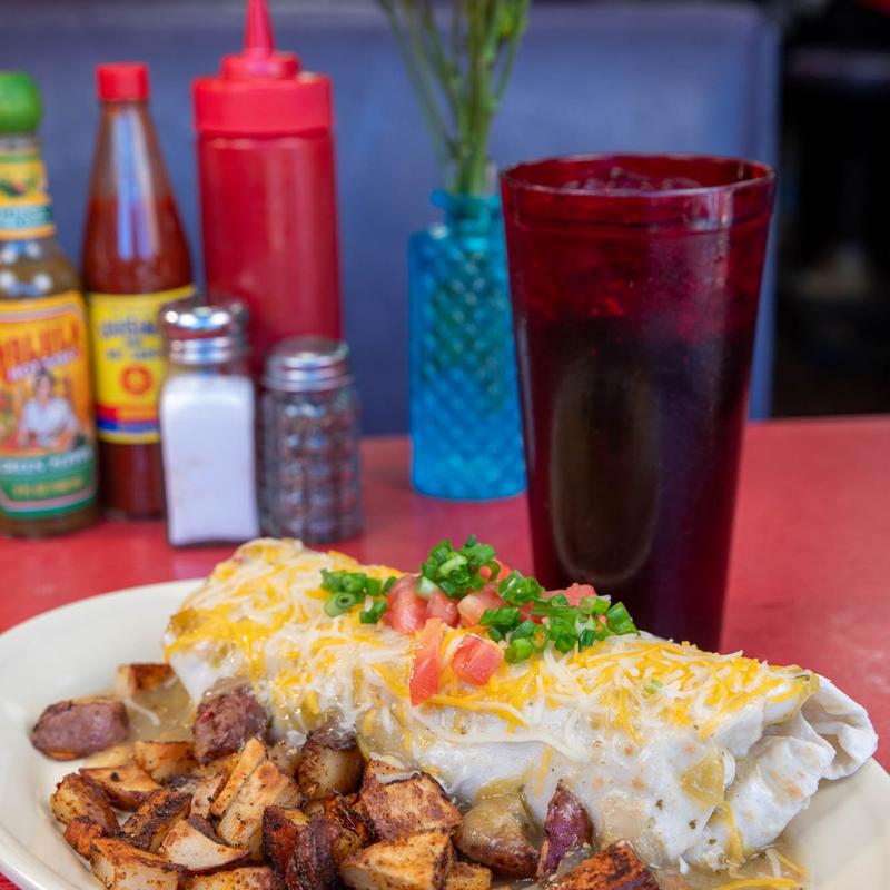 Scrambled eggs with tomato, onion, green chiles, jack and cheddar cheese wrapped in a flour tortilla and smothered with ranchero sauce and more cheese. Served with hash browns or home fries • Add bacon, ham, or sausage +$2.75